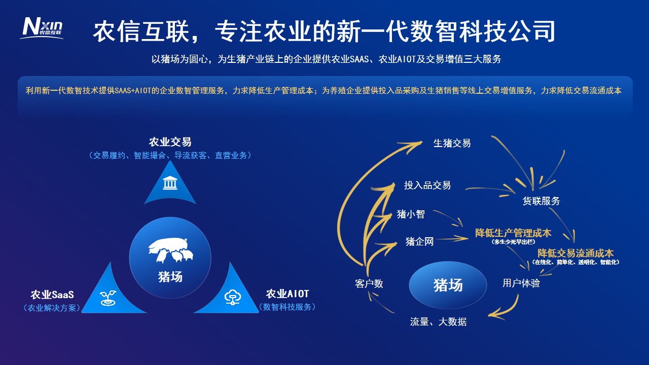 作为专注农业的新一代数智科技公司,农信互联利用新一代数智技术提供SAAS+AIOT的企业数智管理服务,力求降低生产管理成本;为养殖企业提供投入品采购及生猪销售等线上交易增值服务,力求降低交易流通成本。