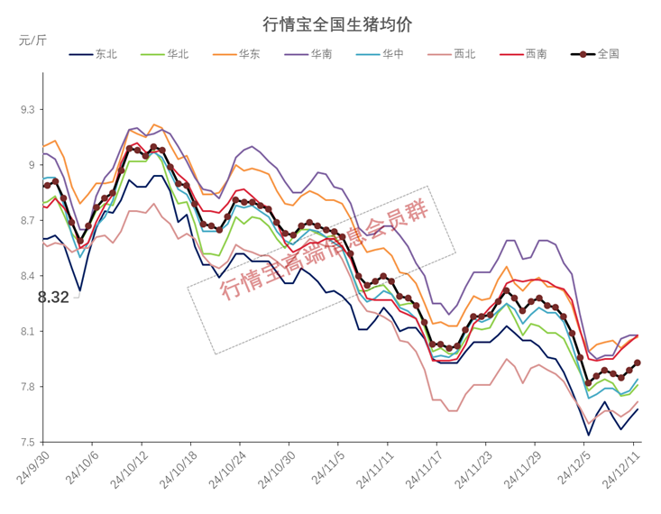 分地区来看,东北地区散户抵触低价,惜售情绪较重,猪价持续上调,高价区出栏积极性较高。华北地区集团场领涨,地区猪源外调增多,支撑猪价上调。华中地区需求有明显提升,养殖端挺价惜售,涨幅较为明显。华东地区屠企订单情况尚可,出栏稳定,受周边市场带动,猪价有稳有涨。华南地区供需相对平衡,养殖端观望情绪较重,猪价持稳。西南地区腌腊需求提升,大猪需求增加,带动标猪价格上涨,养殖端挺价情绪较强。