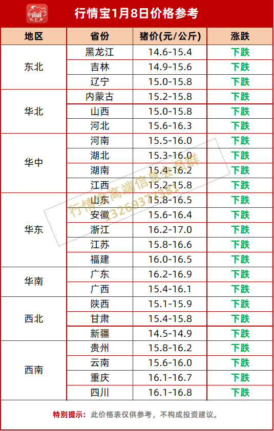 整体来看,腊八节前备货期结束,之后需求短时回落,需求疲软;养殖端出栏积极性较高,市场供给充足,市场明显消化乏力,预计明日市场猪价整体继续下跌0.2元/公斤左右。(行情分析仅供参考)