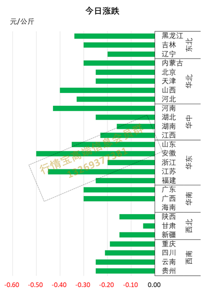 今日全国生猪市场整体继续下跌,多省份跌幅达到0.4元/公斤以上。全国26个省份均价下跌,无均价上涨省份,其它省份均价持稳。均价最低省份为新疆,外三元生猪均价为14.86元/公斤;均价最高省份为广东(除海南外),外三元生猪均价为16.70元/公斤。