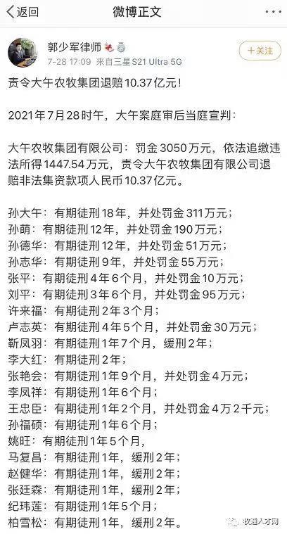据保定市中级人民法院官微消息,2021年7月28日,河北省高碑店市人民法院依法对河北大午农牧集团有限公司孙大午案公开宣判。孙大午犯下8大罪状,被判处有期徒刑18年,并处罚金311万元!